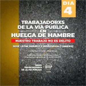 Compañeros de la Rama de Trabajadores de la vía pública de la Unión de Trabajadores de la Economía Popular (UTEP), mantienen hoy, el cuarto día consecutivo, de acampe y huelga de hambre en el barrio porteño de Liniers, en reclamo al Gobierno de la Ciudad de Buenos Aires para que les “permita trabajar”.