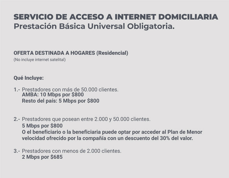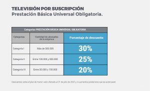 Este beneficio tiene como objetivo facilitar el acceso a servicios de televisión por cable, telefonía fija, telefonía móvil e internet a los sectores con menos ingresos y la población vulnerable. El mismo se dispuso el 1 de enero de este año, donde fueron anunciados como servicios esenciales ante la actual pandemia.