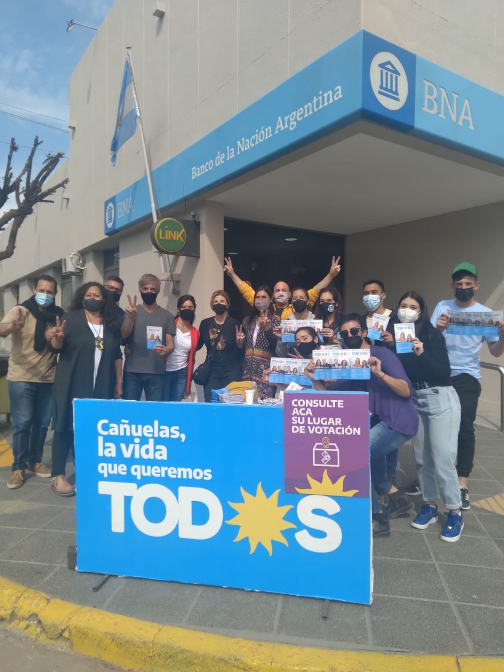 Repitiendo la misma acción que el sábado pasado funcionarias y funcionarios, referentes sociales y barriales, se hicieron presentes en el centro de Cañuelas, a metros del banco Nación ubicado en las calles Libertad esquina
