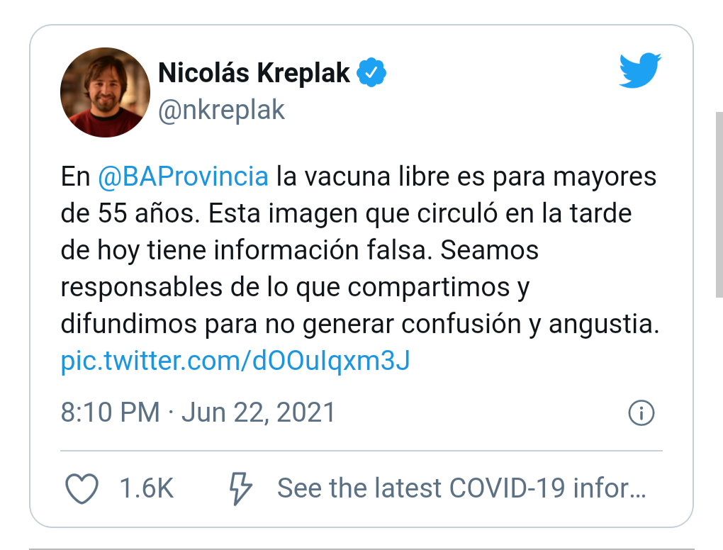 “La vacunación libre es para mayores de 55 años. Esta imagen que circuló en la tarde de hoy tiene información falsa. Seamos responsables de lo que compartimos y difundimos para no generar confusión y angustia”, escribió el funcionario bonaerense.