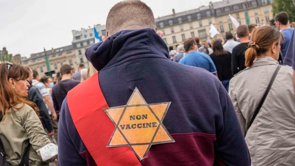 La estrella que fue usada para marcar a las víctimas del Holocausto durante la segunda guerra mundial en los campos de concentración es utilizada como simbología de estos grupos ultraderechistas denominados antivacunas.