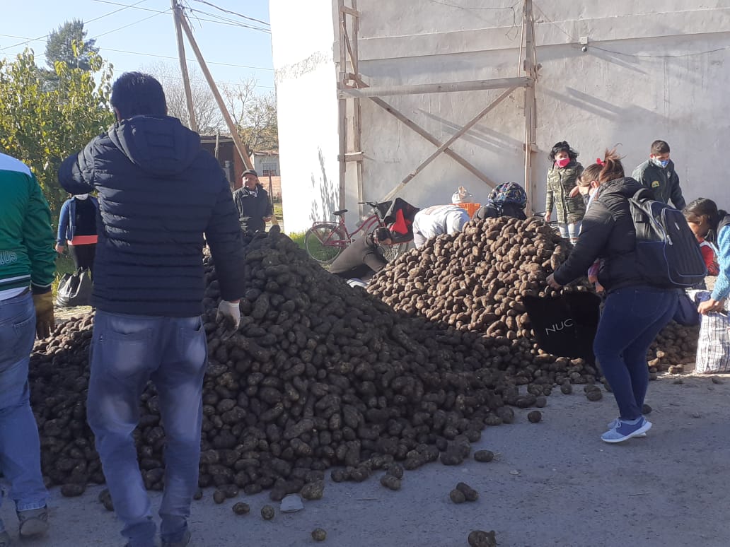 Más de 15 mil kilos de papas fueron repartidas durante esta mañana en la esquina de ruta 205 y República del Perú, a cientos de vecinos de la localidad de Máximo Paz que se acercaron al lugar.